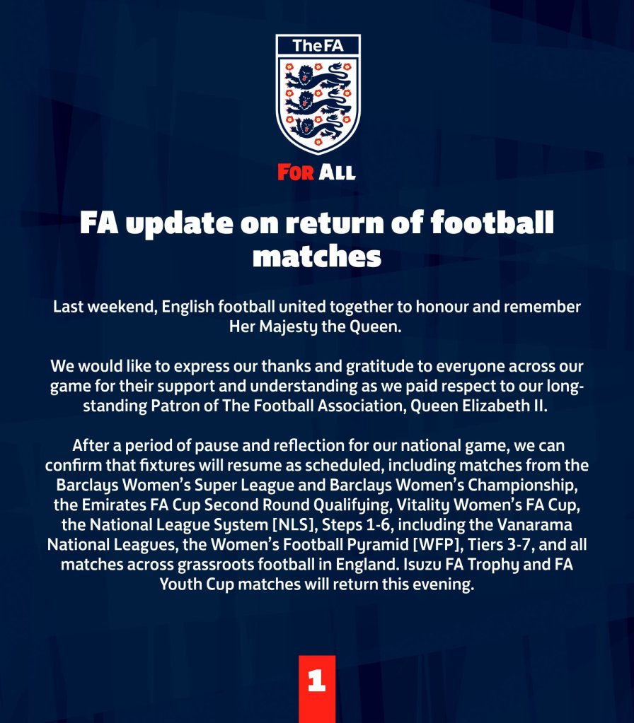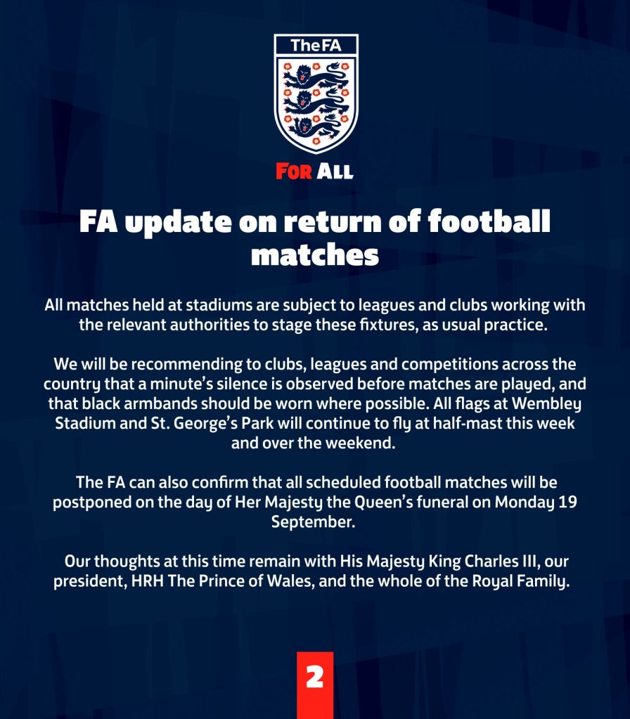 FA update Posted bysimonashberrySep 12, 2022Posted inNews The FA has issued an updated on the resumption of football following last week’s postponement of all fixtures: Share this: Click to share on X (Opens in new window) X Click to share on Facebook (Opens in new window) Facebook Like Loading... Related