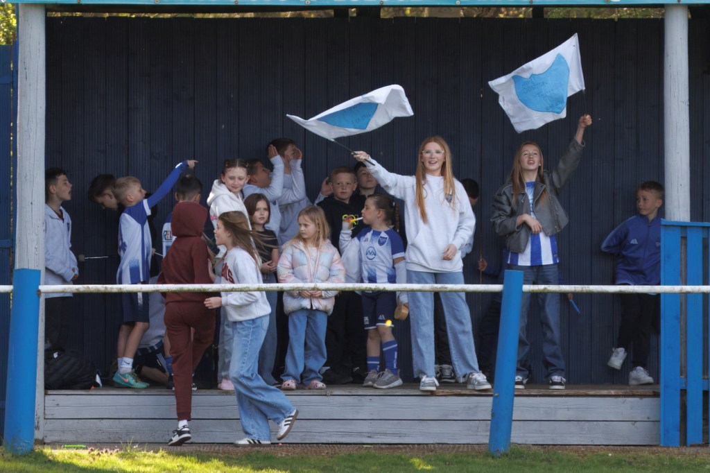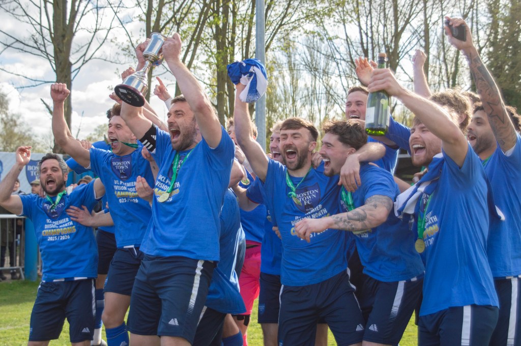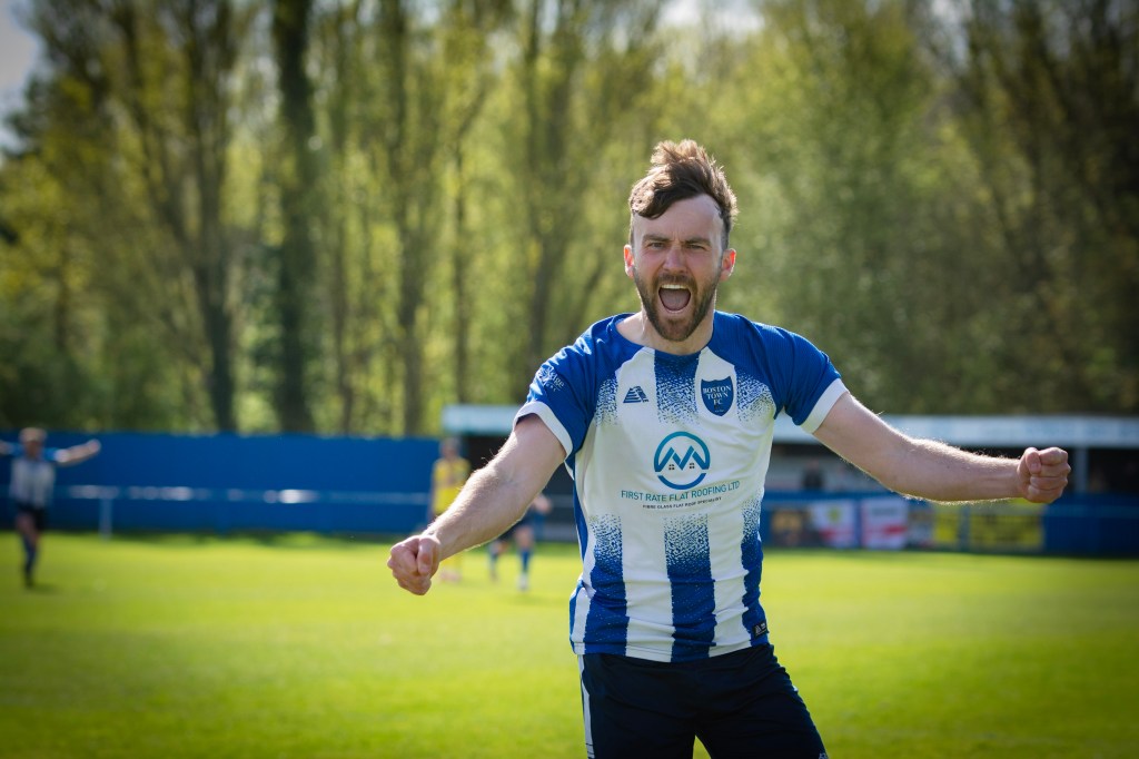 Richard Ford and the team lift the trophy – photo: (c) Joshua Hallam Zak Munton celebrates after making it 2-0 – photo: (c) Joshua HallamThe flags are out for the champions – photo: (c) Steve DaviesWhat better way to celebrate than with a packet of crisps? – photo: (c) Steve Davies
