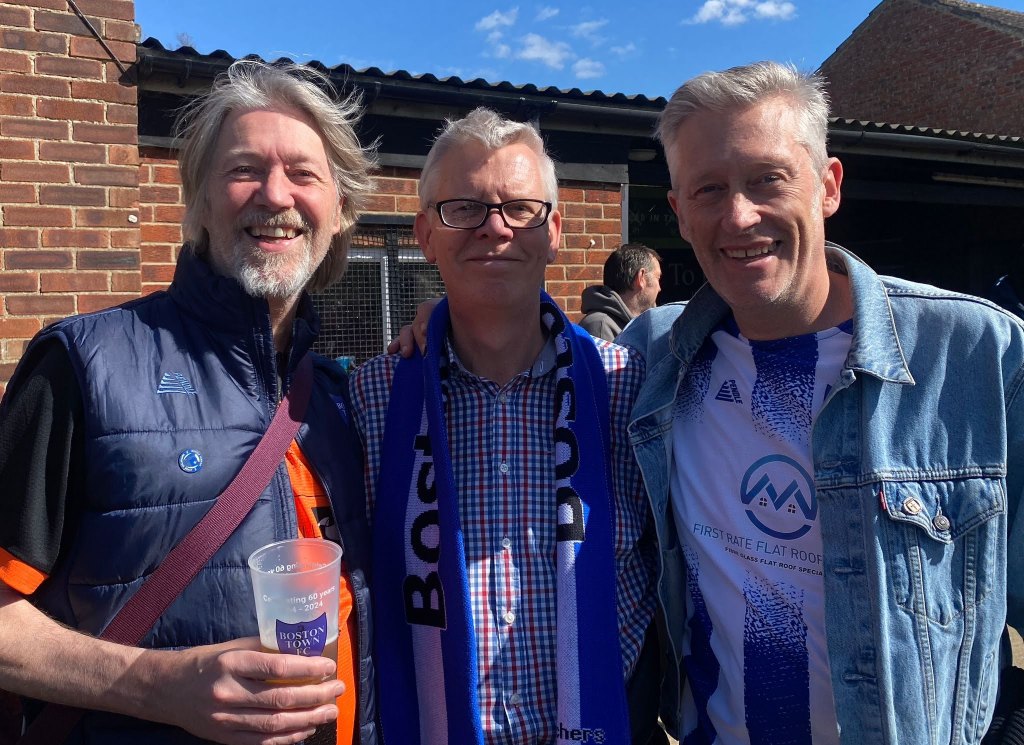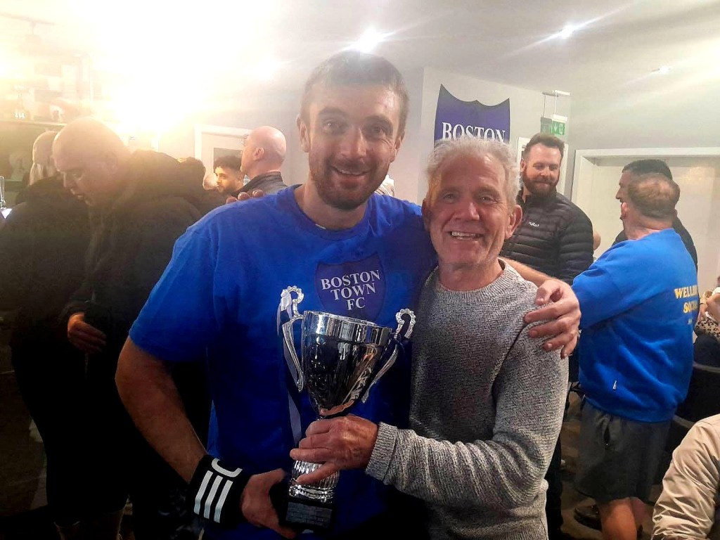 Dave Holmes (right), who flew in from Barcelona for the match, with Simon Ashberry and Jez Ashberry Curly Himsworth (right), who won the league with Boston FC in 1978-79 and 1980-81, celebrates with current captain Richard Ford