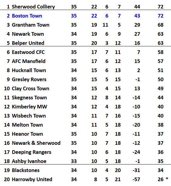 Premier Division North Table correct to Saturday 28 March 2026: * Harrowby deducted 3 points for playing an ineligible player